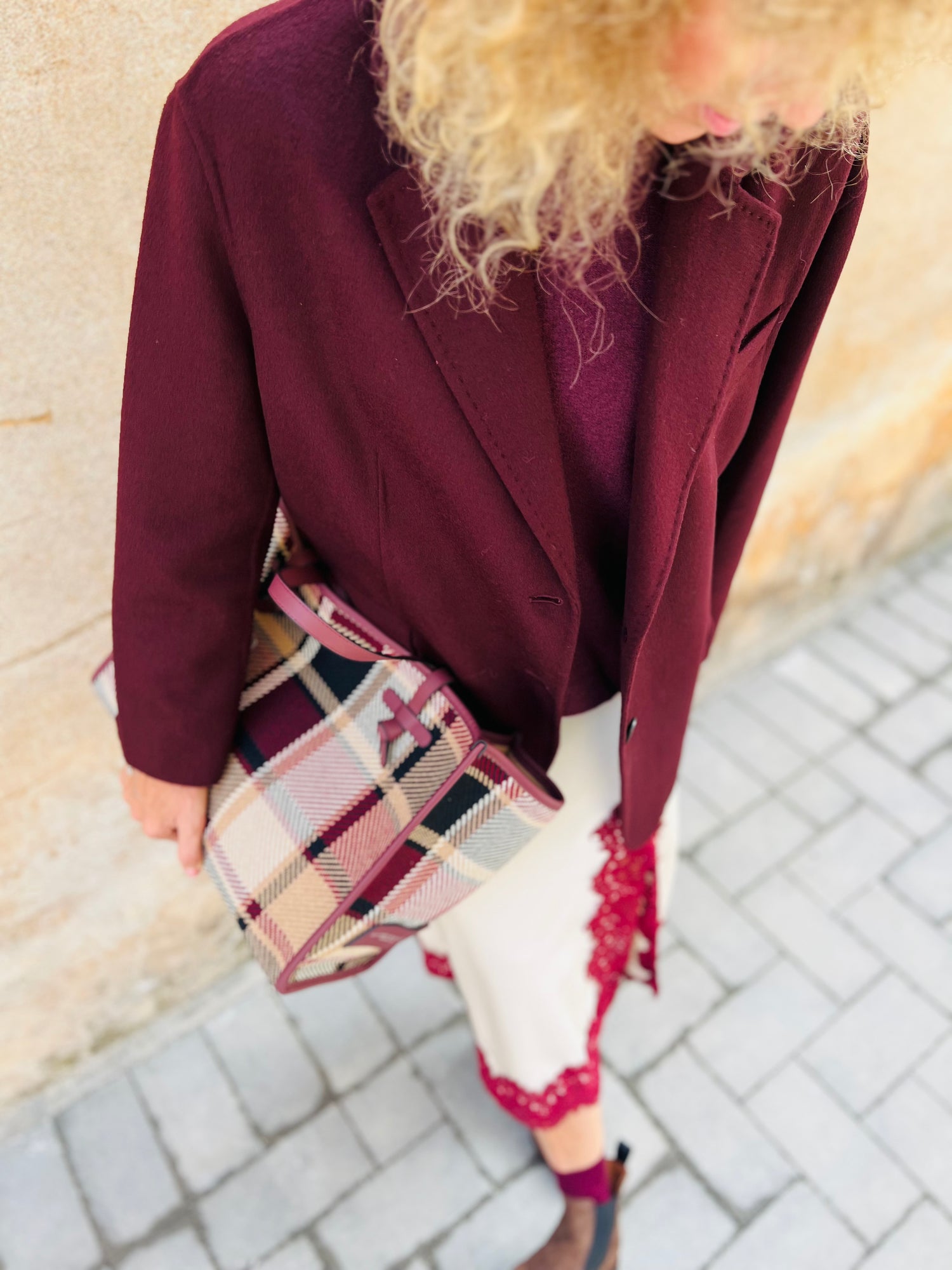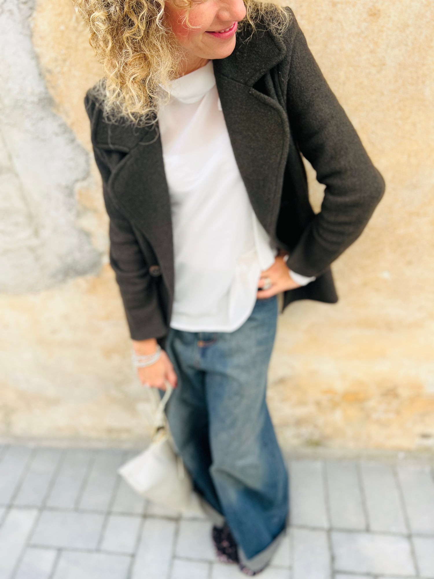 Giacca doppio petto slim Camicia bianca in seta Jeans over Borsa a...
