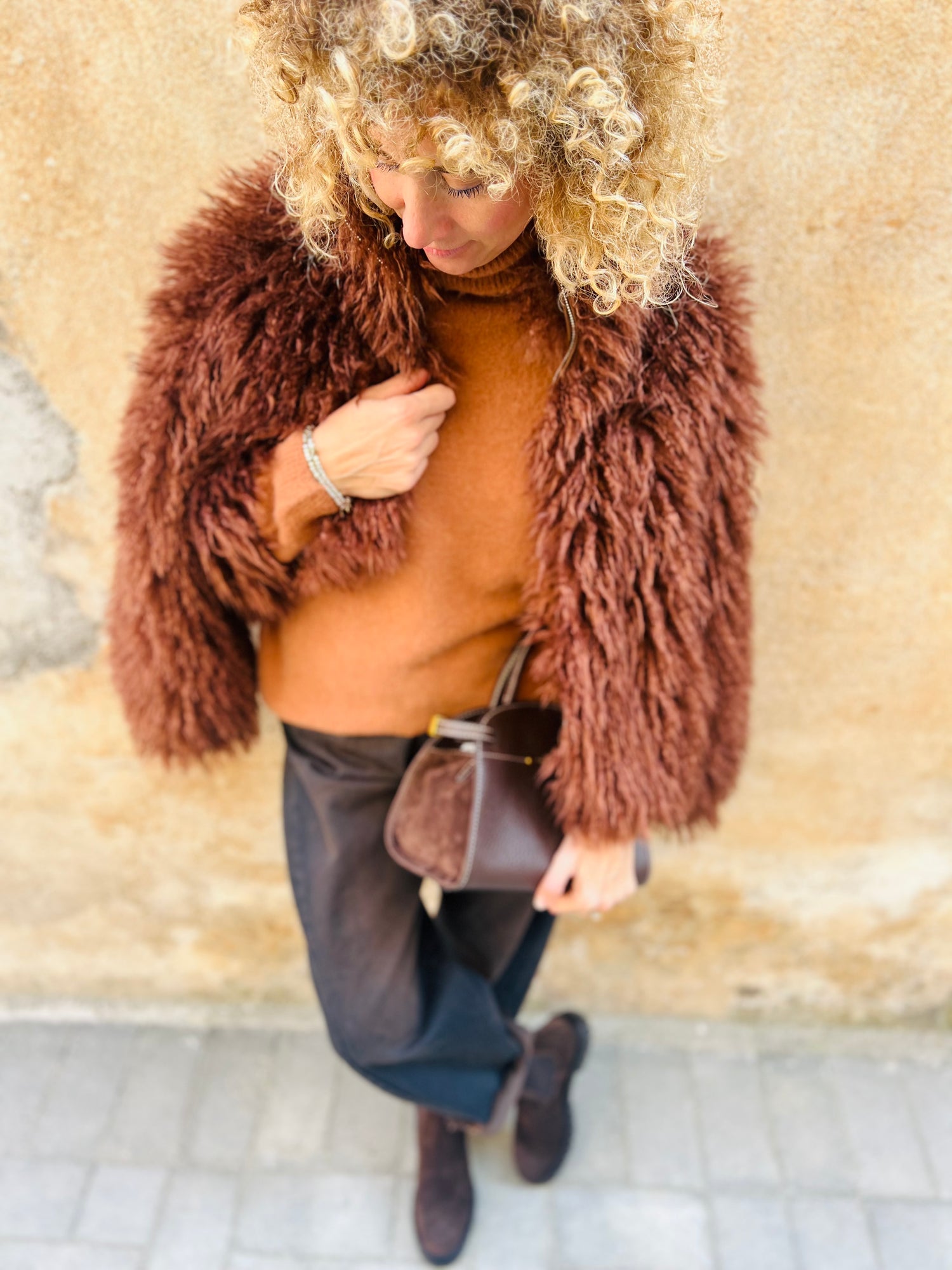Giaccone effetto pelliccia Dolcevita in pura lana Pantalone carrot polacchino scamosciato