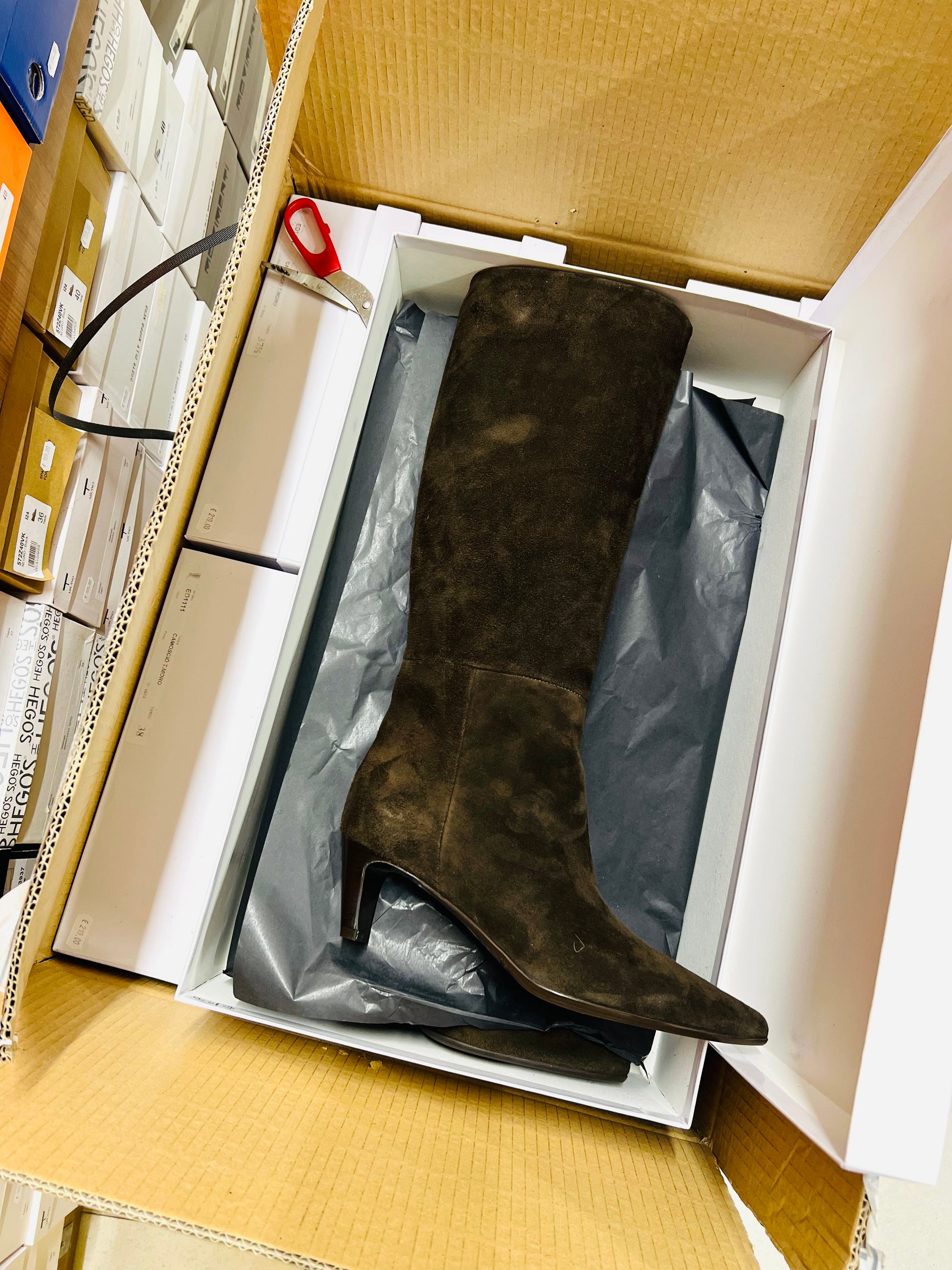 La base perfetta per l'autunno: un paio di stivali al ginocchio o tronchetti alti a punta in pelle scamosciata o liscia, in un classico marrone molto scuro. La linea affusolata slancia la figura, mentre il gambale aderente si abbina in modo impeccabile con la gonna midi, aggiungendo un tocco finale grintoso e allungando la gamba.