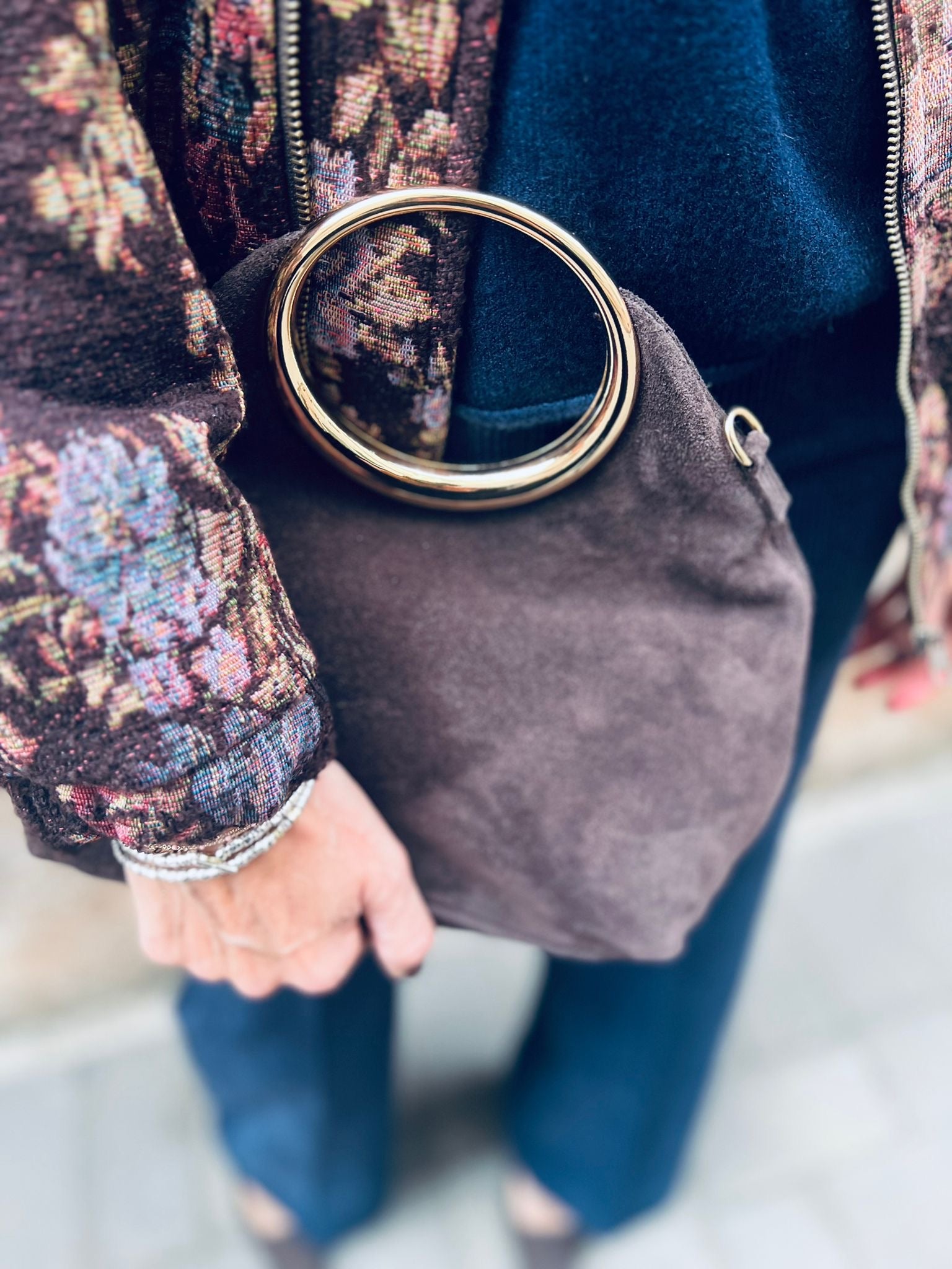 Una borsa a mano piccola ma effetto. Realizzata in camoscio marrone, è impreziosita da un manico ad anello dorato che aggiunge un tocco gamma al tuo look. Si può portare a mano o a tracolla con la sottile catenella dorata.