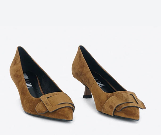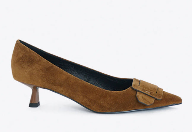 Decolletè elegante in camoscio marrone offre un tocco di raffinatezza moderna. La punta affusolata e il tacco a rocchetto di 5 cm creano una silhouette slanciata, perfetta per allungare la figura. la fibbia decorativa in camoscio sulla tomaia aggiunge un dettaglio chic distintivo. Queste scarpe sono ideali per l’ufficio, un aperitivo o una serata elegante abbinandosi perfettamente a pantaloni sartoriali o abiti MIDI.