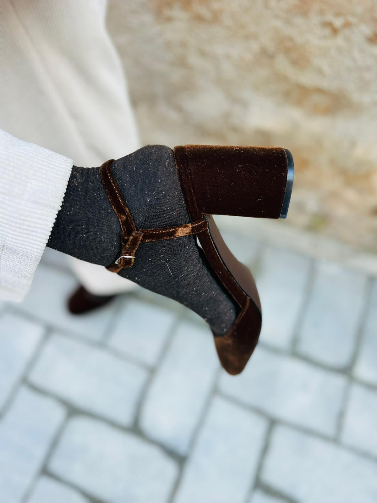 Questa Mary Jane reinventa un grande classico con uno stile contemporaneo. Il tacco largo e squadrato che garantisce stabilità e comfort, mentre la punta affusolata slancia la figura. Disponibile in velluto verde bosco per una texture sofisticata, questa scarpa è l’accessorio ideale per elevare ogni outfit con eleganza senza tempi.