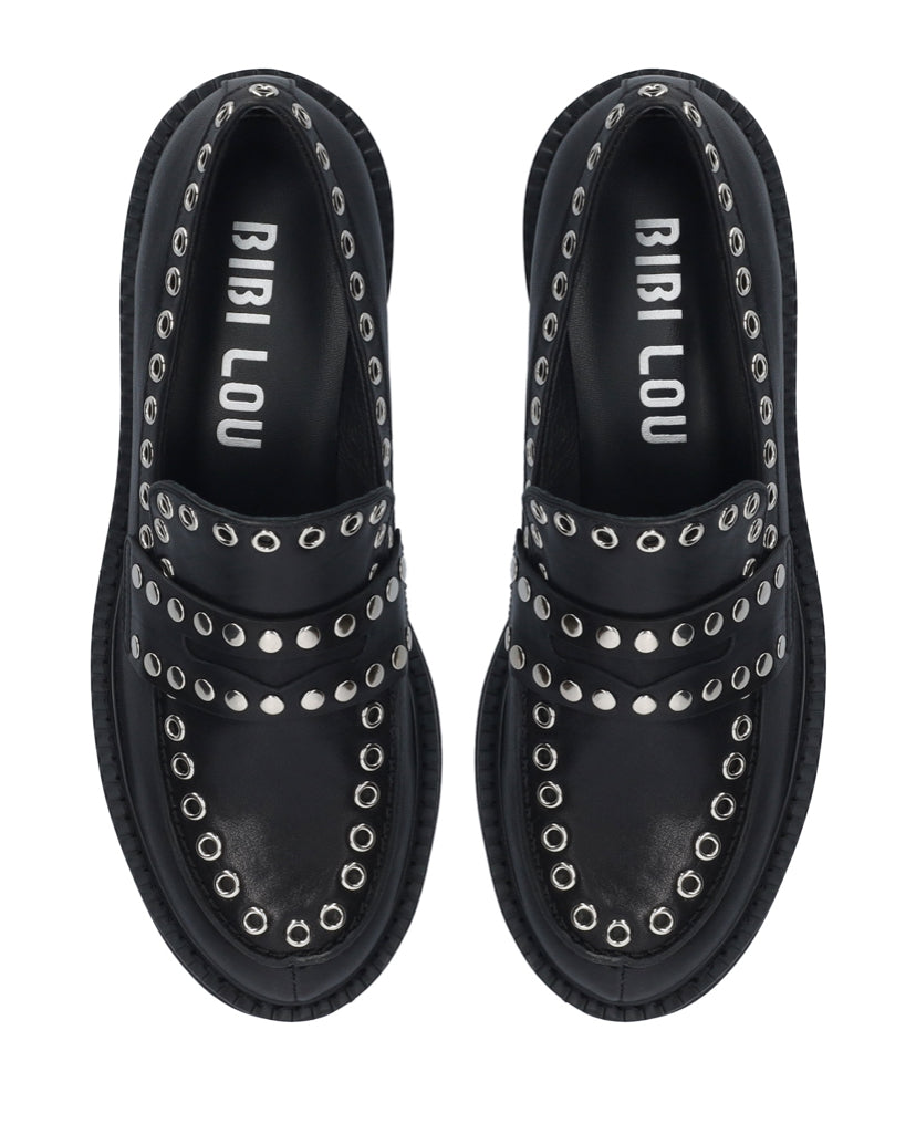 Questo mocassino unisce l’eleganza classica, un tocco audace moderno.le borchie metalliche e gli occhielli decorativi aggiungono un carattere deciso, mentre la suola alta offre comfort e stile.ideale per chi vuole distinguersi con un accessorio che non passa inosservato
