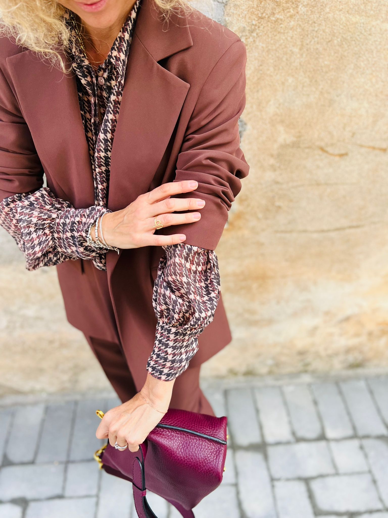 Eleva il tuo stile con il Blazer Sartoriale che riscrive le regole dell'abbigliamento formale. Il sofisticato colore Marsala/Terra di Siena lo rende una dichiarazione di stile, perfetta per l'ufficio o per un evento serale.