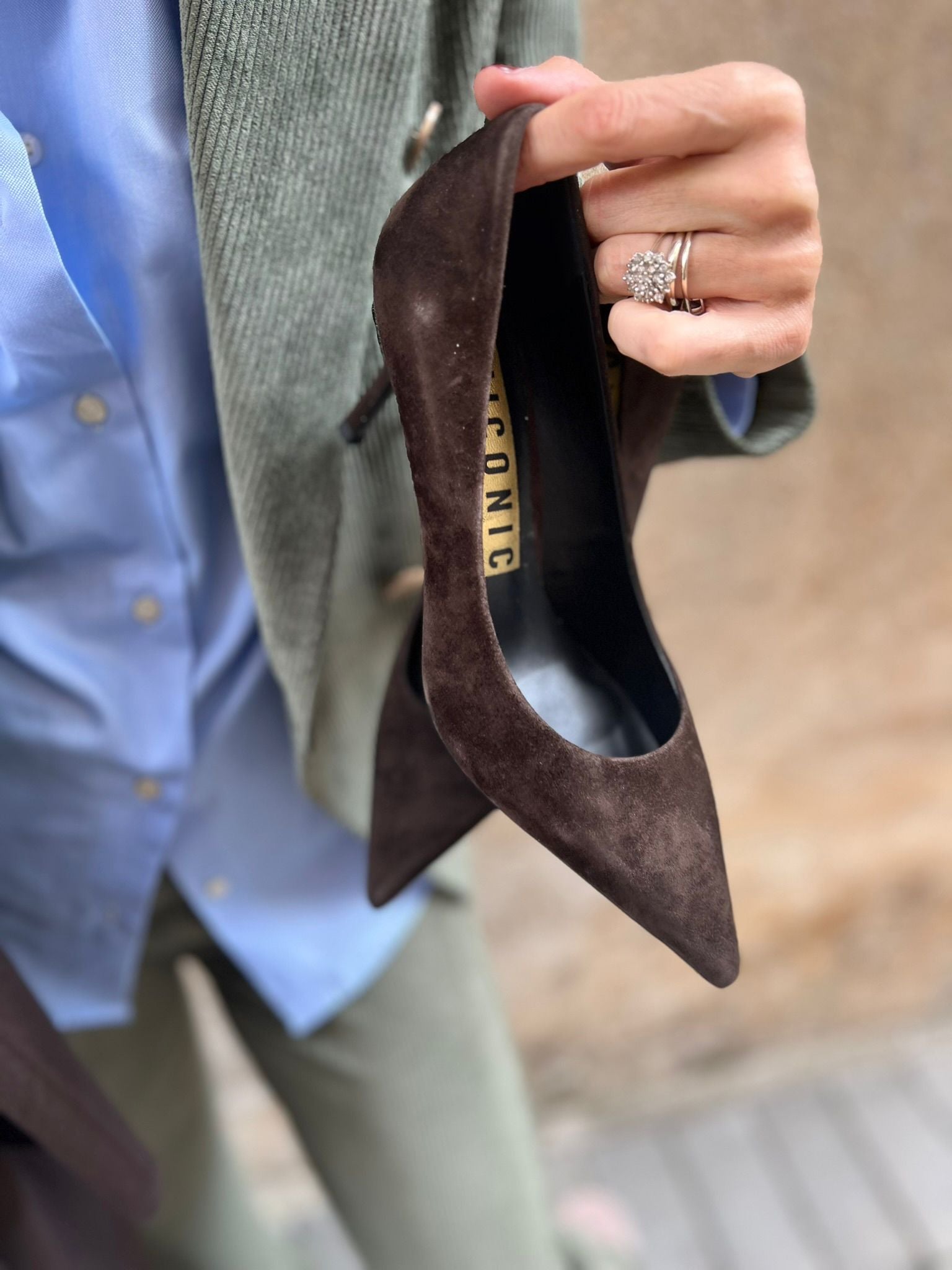 La scarpa che definisce la sensualità: una classica Décolleté a punta affusolata con tacco a spillo. Il tessuto in morbido suede in un ricco colore Marrone Cioccolato aggiunge una texture lussuosa e profonda. Il tacco sottile garantisce un'eleganza insuperabile, ideale per passare da un look giorno a un look sera.