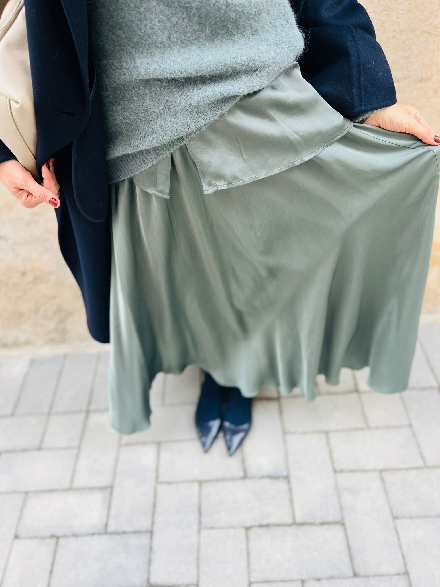 L'effetto è un movimento quasi liquido ed etereo ad ogni passo. La vita alta la rende perfetta per essere abbinata a bluse o a maglioni cropped. Il colore profondo la rende una base versatile che si sposa sia con fantasie audaci (come il blazer check) che con tessuti più semplici.