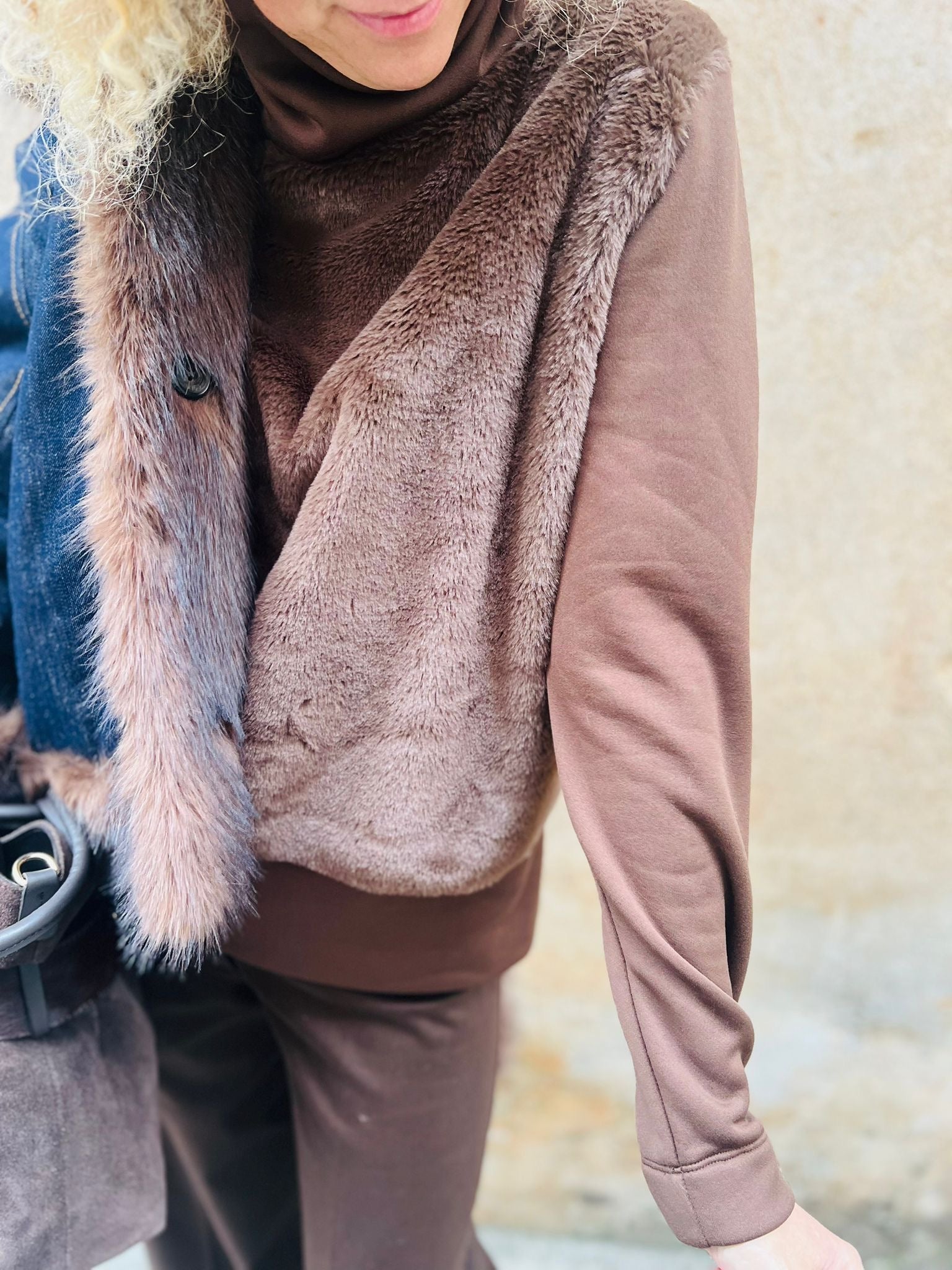 Maglia realizzata in tessuto Stretch Performance con inserti in morbida eco pelliccia su fronte e retro. Un modello ibrido che offre al contempo isolamento termico, traspirabilità e comfort in movimento. La vestibilità rilassata e l'avvolgente collo alto caratterizzano il design versatile di questo capo, perfetto strato intermedio da indossare nelle stagioni più fredde.