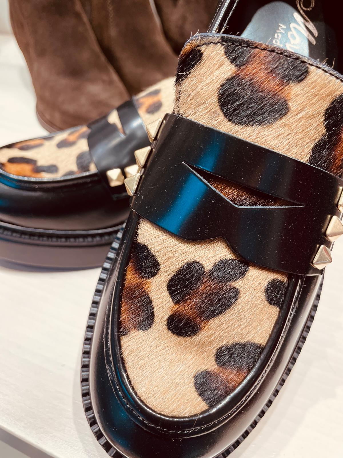 Audaci, contemporanei ed irresistibilmente chic! Questo mocassino reinterpreta il classico modello maschile con un tocco grintoso ed ultra femminile. Realizzati in morbida pelle nera, presentano una tomaia in cavallino effetto leopardato e si distinguono per il design deciso e dalle borchie dorate che donano carattere e personalità.