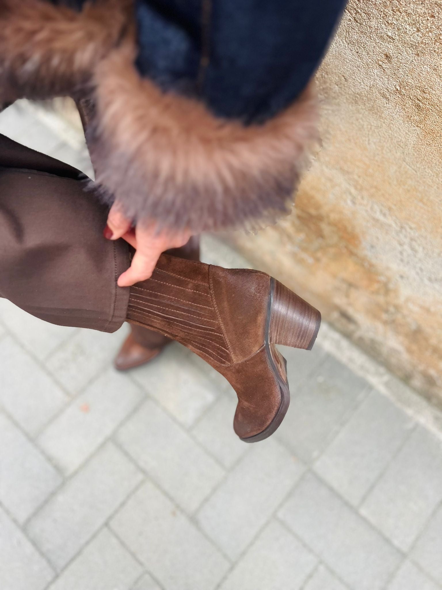 Smettila di scegliere tra stile comfort. Questo tronchetto unisce la praticità e la linea pulita del classico modello Texano con la texture vellutata del camoscio marrone scuro, arricchito da un tacco svasato di ispirazione western. È l’alleato perfetto per rilevare ogni tuo look, dal denim il vestito midi.