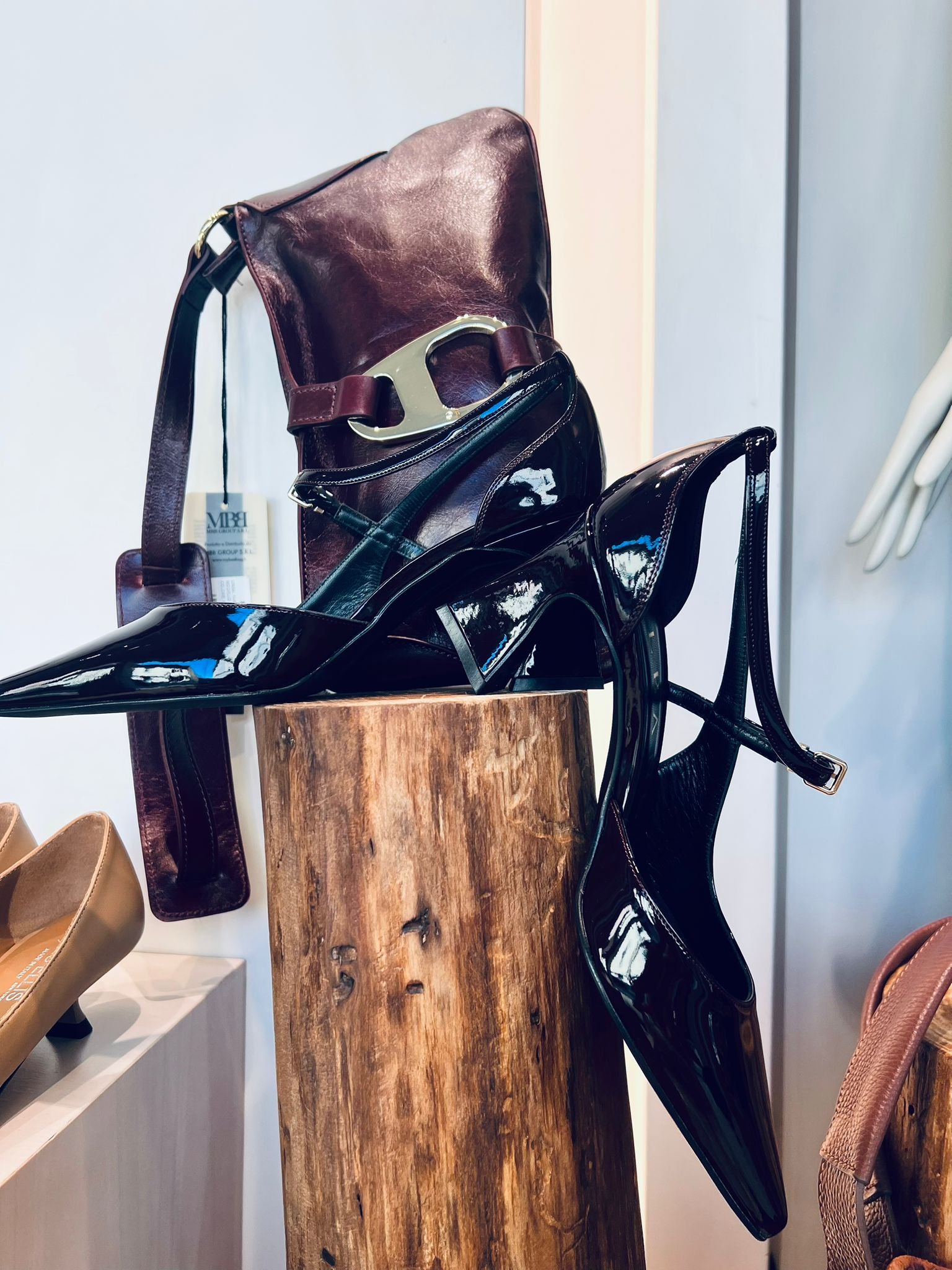 Riscopre l’eleganza senza tempo con questa Décolleté che combina raffinatezza e un design moderno. Realizzato in vernice Rouge noir ultra lucida, presenta una punta affusolata e un tacco scultoreo che aggiunge un tocco di design.il cinturino regolabile assicura stabilità è una calzata perfetta. Queste scarpe sono l’accessorio ideale per un evento speciale, una cena elegante o per dare un tocco di classe a un outfit da ufficio.