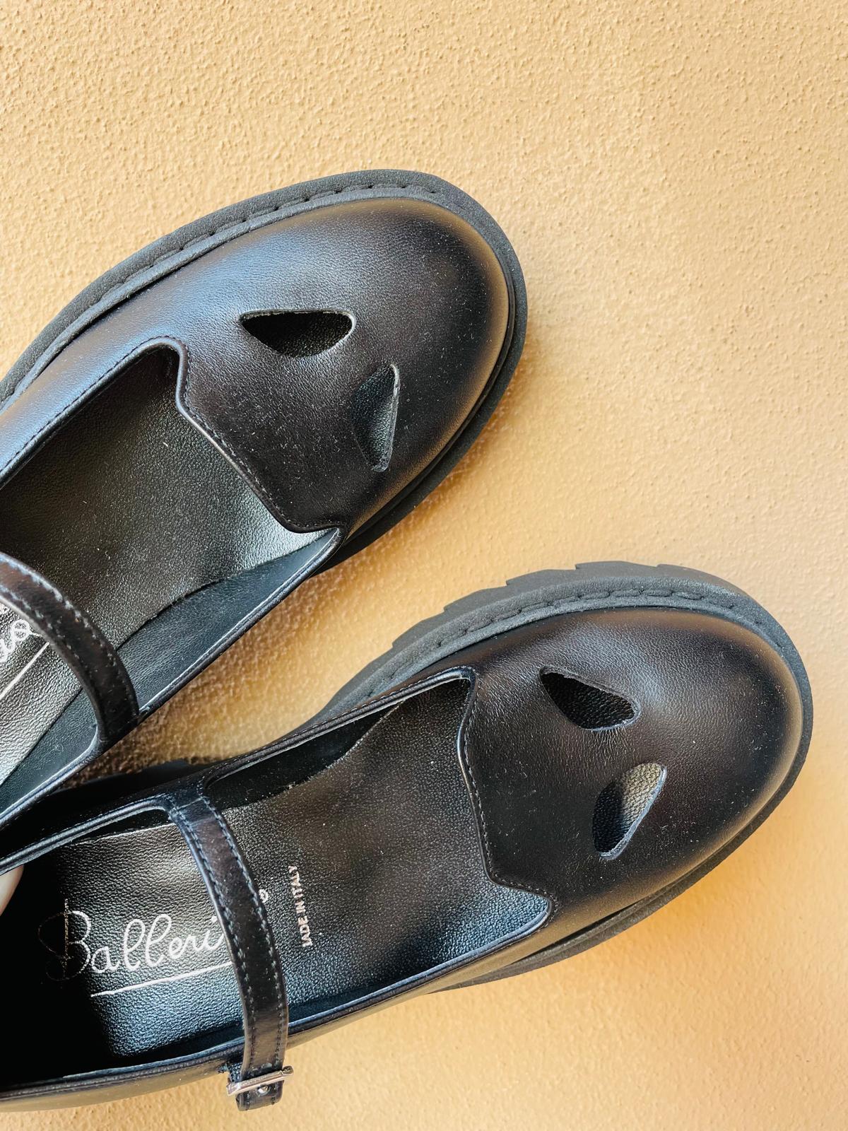 Un modello di Mary Jane in pelle, dal carattere audace e minimalista. La tomaia presenta due tagli ovali, quasi a voler rilevare una parte del piede in modo inaspettato e seducente. La scarpa è dotata di un cinturino regolabile che garantisce una calzata sicura e sottolinea lo stile deciso del design.