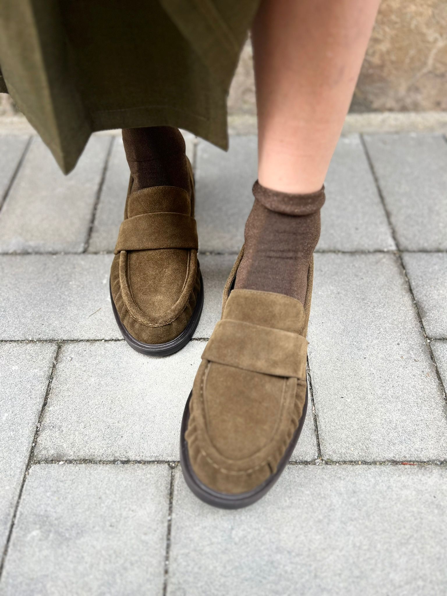 Il mocassino che unisce la morbidezza del camoscio al trend della suola chunky . Questi Loafer sono realizzati in morbido camoscio nella ricca e profonda tonalità verde loden, un colore chiave per la stagione.