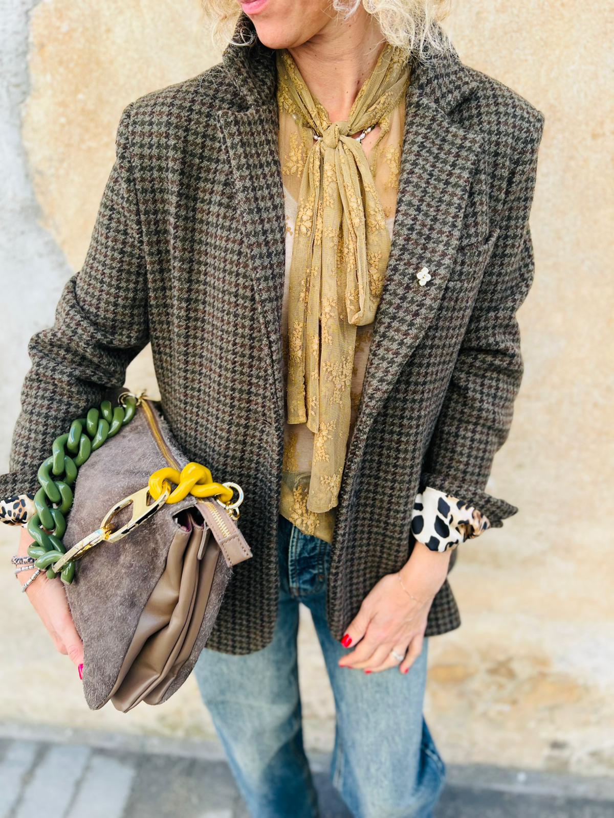 Un blazer strutturato dal taglio tradizionale, probabilmente in tessuto caldo come il tweed. La fantasia a quadretti, minuti le conferisce un’area sofisticata e vintage.