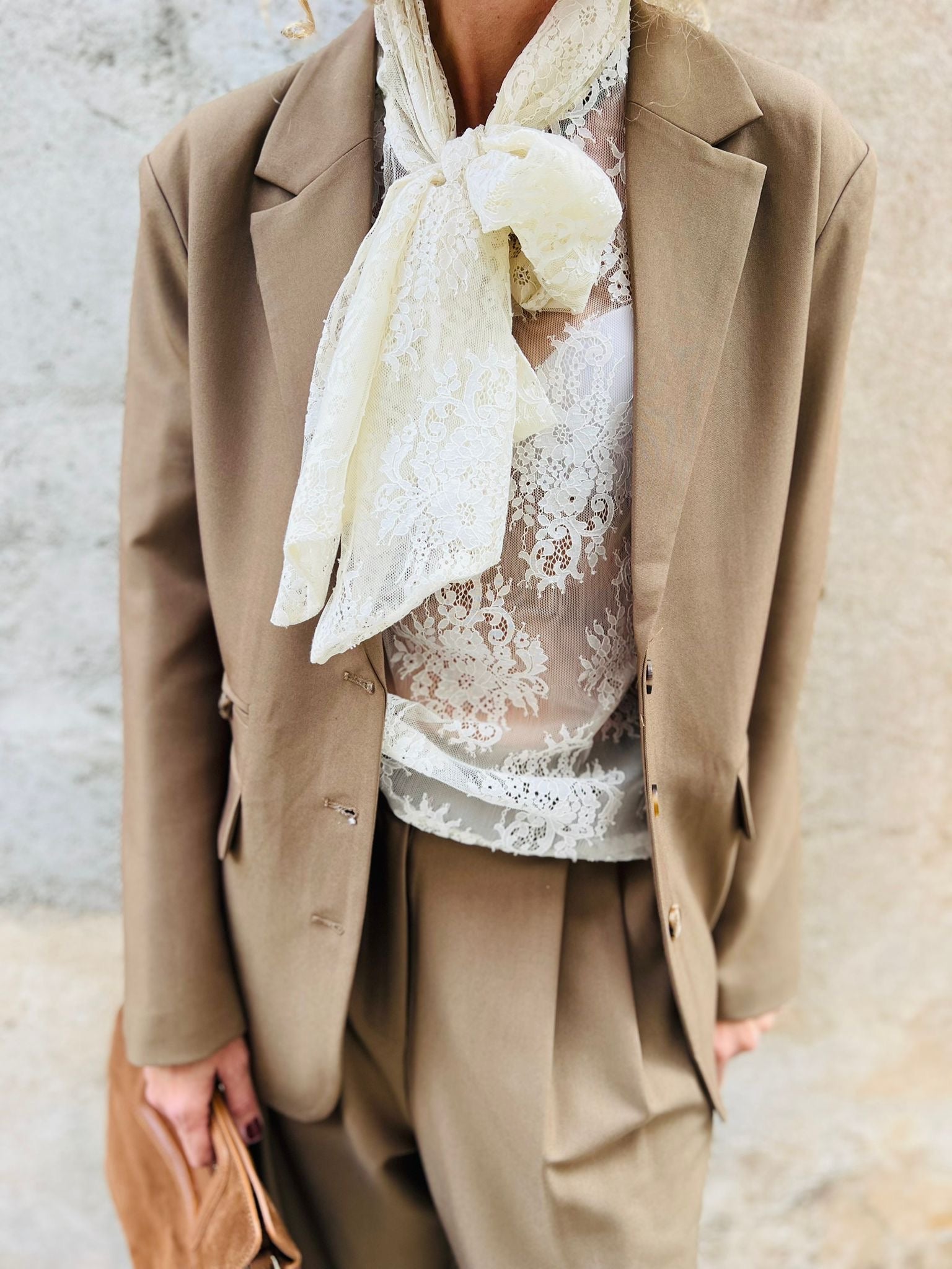Blusa realizzata in pizzo color crema. Perfetto sotto i completi, in quanto il tessuto trasparente intarsiato contrasta splendidamente la serietà di delle giacche più formali.