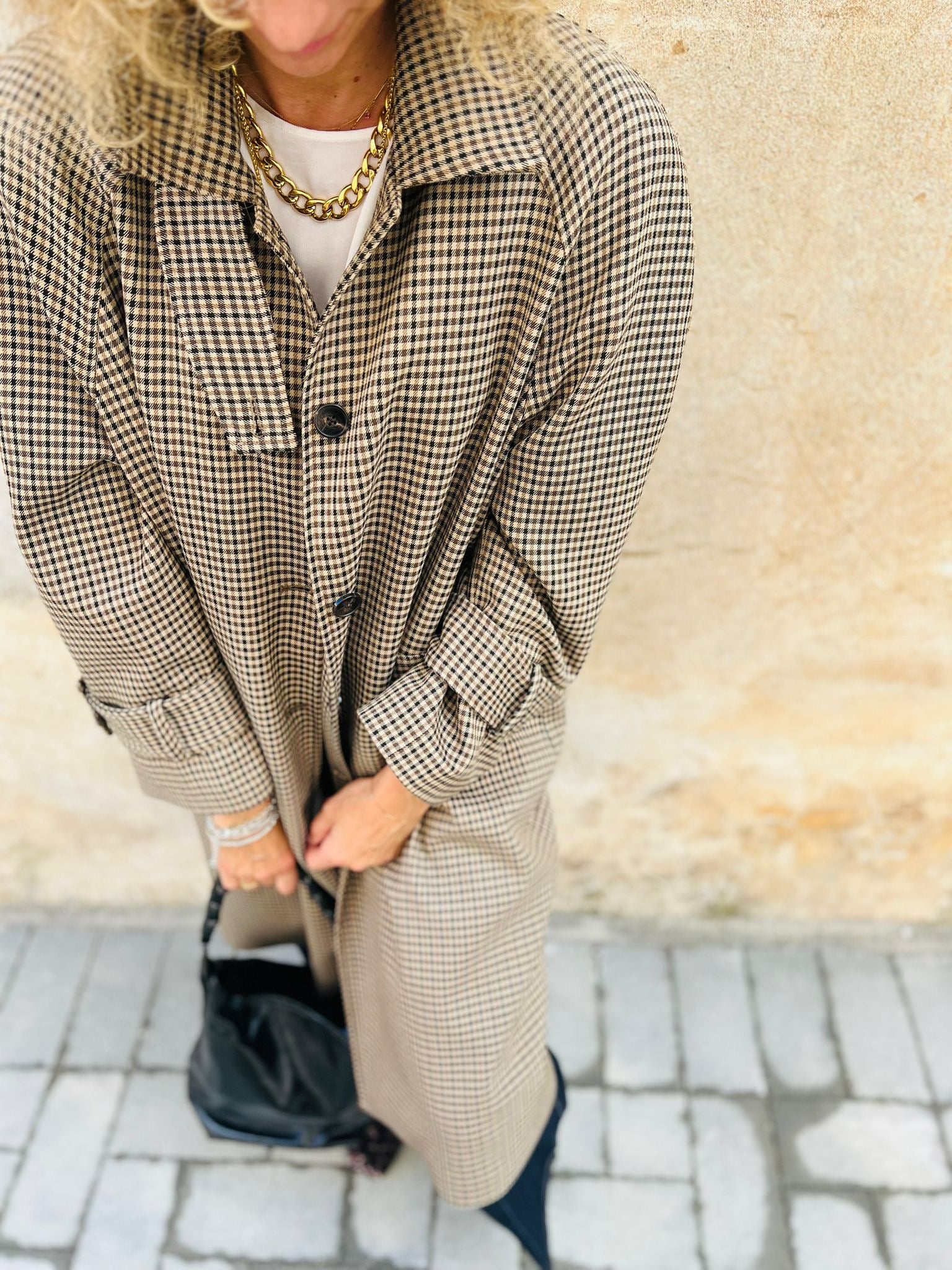 Dimentica il solito beige: questo Trench Coat rivisita un classico senza tempo con una sofisticata fantasia micro check (o pied de poule) nei toni del marrone e nero/blu notte. È il capospalla perfetto per la mezza stagione e oltre.